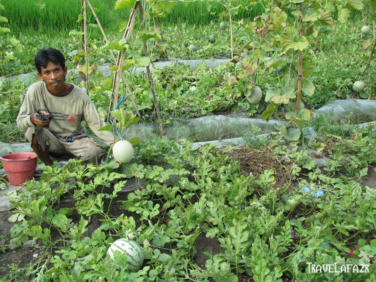 Berjalan sedikit memutar dari villa, saya menemukan sepetak kebun melon dan semangka yang baru kali pertama itu saya melihat langsung rupanya. Sangat menarik perhatian dan memancing keingintahuan, tentu saja. Saya menyapa Kang Diman (bukan nama sebenarnya) yang saat itu sedang sibuk dengan melon-melonnya, tapi lalu menghentikan aktivitasnya begitu melihat kedatangan saya. Sambil tersenyum, Kang Diman menyapa. Kang Diman ini perantau dari Jawa rupanya. “Petani Bali mana ada yang bisa nanam melon dan semangka mba”, begitu katanya bangga sambil menunjukkan hasil panen semangkanya yang lebih besar dua kali lipat dari semangka yang biasa saya lihat. Menurutnya, menanam melon lebih sulit daripada menanam semangka, meskipun siklus hidup keduanya hanya berbeda 5 hari. Apalagi kebunnya dekat dengan pantai yang sangat rentan terpaan angin kencang. Kang Diman sendiri tinggal di sebuah gubuk 2×2 meter yang berdiri di tengah kebun, diantara bayang-bayang deret villa mewah. Bersama buah-buahan yang ia tanam, Kang Diman menikmati hempasan angin pantai tiap malam.