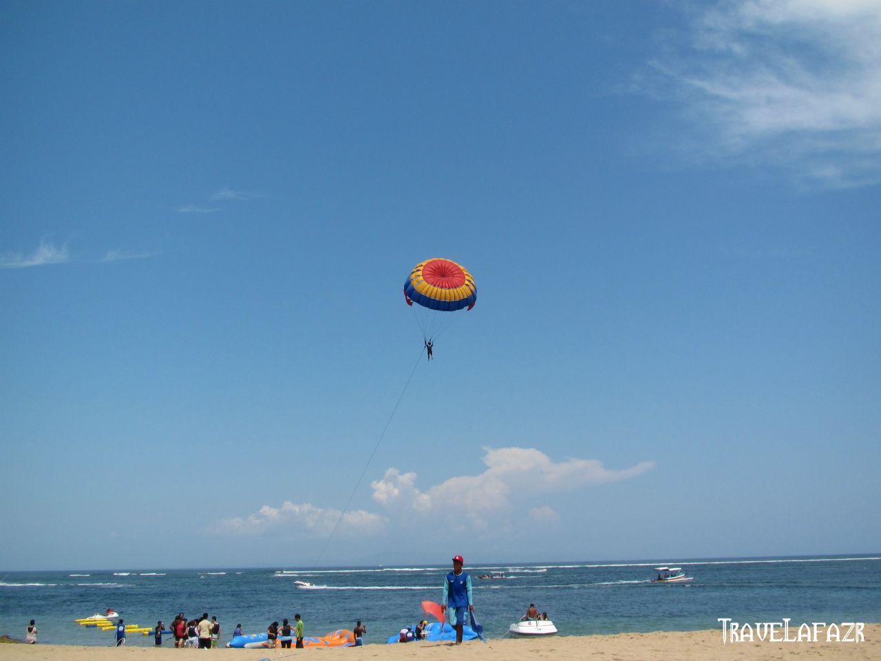 Disinilah tempatnya wisatawan uji nyali kecil-kecilan. Mau snorkeling, parasailing, flying fish, atau main jetski dan banana boat, semua ada disini. Setiba di lokasi sekitar jam 12 siang, saya mengulur waktu untuk mencoba parasailing karena alasan matahari sedang sangar-sangarnya, padahal lagi mengumpulkan sebungkah keberanian tuh :-P. Gak taunya ternyata sekitar jam 2an ada pengumuman kalau aktivitas permainan air dihentikan karena air laut surut. Haduhh.. Beneran dehh, saya menyesal berkepal-kepal. Well, kalau ngeliat ombaknya yang tenang, sih, sepertinya pantai ini asik buat berenang, juga untuk aktivitas snorkeling bagi pemula. Tak ada retribusi untuk masuk ke pantai ini. Paling-paling hanya akan dikenakan biaya parkir. Untuk tarif permainannya, memang cukup mahal kalau belinya per permainan. Biar lebih murah, mendinglah beli paket yang ditawarkan travel agent. Saya sempat melihat infonya di brosur yang tersedia di booth-booth bandara.
