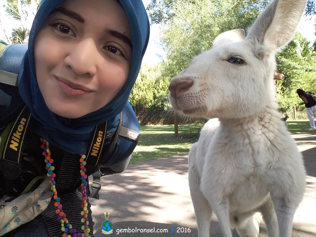 Kandang kanguru menjadi atraksi pertama yang kami sambangi. Ada ratusan kanguru yang diperlihara di kebun binatang ini, dimana sebagian besar dari mereka bahkan lahir di taman ini. Beth lantas mempersilakan kami berinteraksi dan memberi makan kanguru yang kemudian dengan sukacita kami terjemahkan sebagai tawaran untuk berselfie. Saya menduga semua kanguru yang berada di sini memang sudah terlatih dengan ajakan berselfie. Beberapa kanguru yang saya ajak foto bersama bahkan langsung merespon dengan mengarahkan wajahnya ke bidikan kamera.